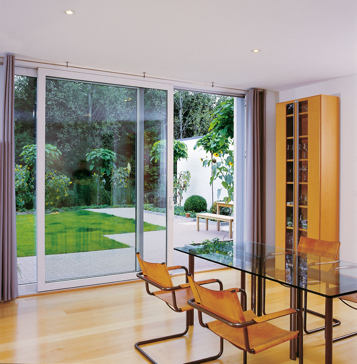 Schiebetüren bringen durch ihre großen Glasflächen viel Licht in die Wohnräume und bieten direkten Zugang zu Garten oder Balkon. Hebe-Schiebetüren bieten sich besonders an, wenn große Scheiben bewegt werden sollen. Die Flügel ruhen auf getrennten Schienen, beim Öffnen wird ein Flügel leicht angehoben und zur Seite geschoben.